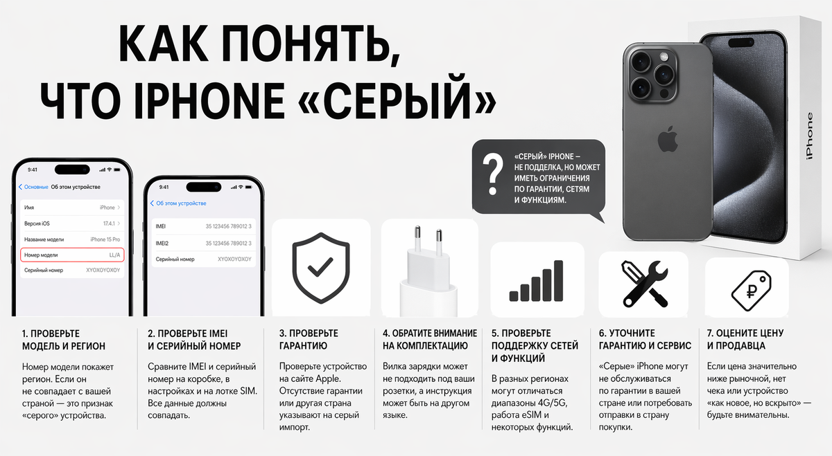 Термин «серый iPhone» означает устройство, ввезённое в страну неофициально — в обход авторизованных каналов Apple. Такие смартфоны могут быть оригинальными, но не предназначенными для продажи в вашей стране. Это влияет на гарантию, поддержку и иногда — на функциональность. Разберёмся, как отличить «серый» iPhone от официального. Самый надёжный способ — посмотреть номер модели: Настройки → Основные → Об этом устройстве → Модель Обратите внимание на последние буквы, например: Если регион не совпадает с вашей страной — это уже признак «серого» устройства. Особенно важно: Сравните IMEI: Все номера должны совпадать. Затем проверьте устройство на официальном сайте Apple: Если гарантия не активна или уже истекла — устройство могло быть ввезено ранее или восстановлено. «Серые» iPhone часто отличаются по аксессуарам: Например: Разные регионы — разные стандарты: Это редкость, но встречается. Официальные iPhone: «Серые»: Если iPhone: Почти наверняка это «серый» импорт. Иногда под видом новых прод