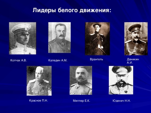 Лидеры: А. Колчак, А. Деникин, П. Врангель, Н. Юденич и др.