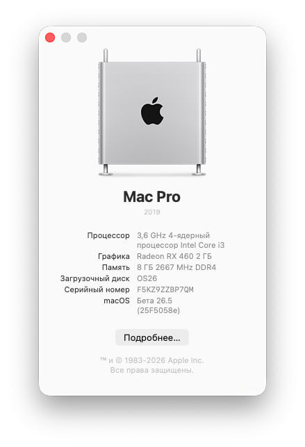 В общем, macOS 26.5 beta3, прям порадовала - работает гораздо шустрее, и не потребовалось удалять патч SBVMM, звук, WIFI+BT завелись наотлично!