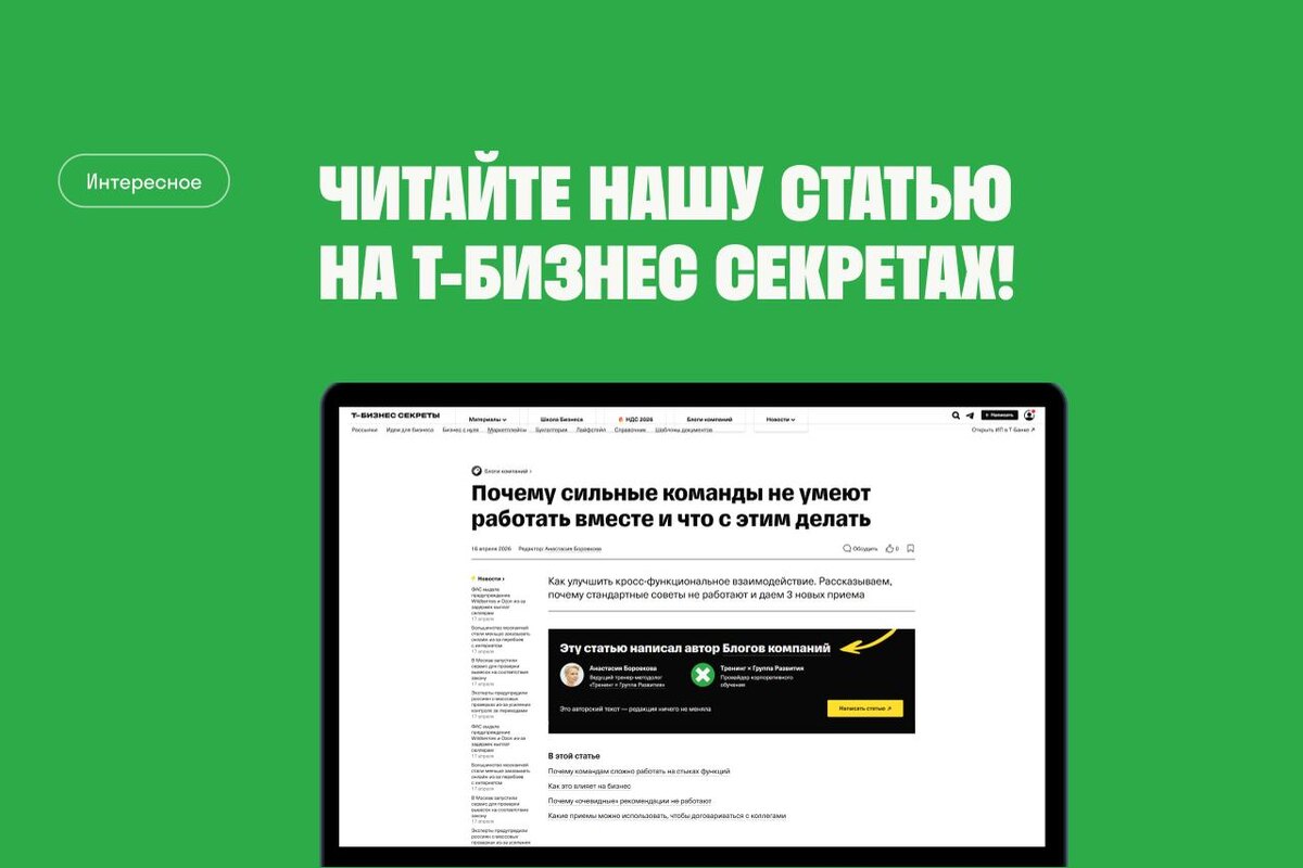 Рассказали о том, почему сильные команды не умеют работать вместе и что с этим делать. В статье Анастасии Боровковой — ведущего тренера-методолога Т×ДГ: — Почему командам сложно работать на стыках функций. — Как это влияет на бизнес. — Почему «очевидные» рекомендации по улучшению взаимодействия не работают. — Какие еще приемы можно использовать, чтобы договариваться с коллегами. 🔗 Читайте по ссылке. Материал будет полезен руководителям, HR и всем, кто работает с командами и межфункциональными процессами.