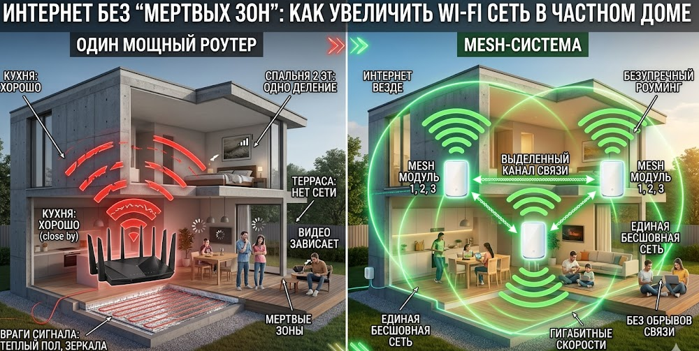 На кухне интернет еле тянет. В спальне на втором этаже одно деление сети, и видео постоянно «зависает». А стоит вам выйти на террасу с чашечкой кофе — сигнал пропадает вовсе. Дети жалуются, что онлайн-игры тормозят, жена не может отправить тяжелый файл по работе, а умные колонки постоянно теряют сеть.