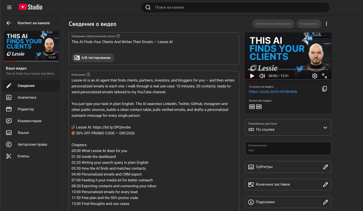 🤯 Видео записано полностью на русском языке. Переведено на английский с движением губ под озвучку. Озвучено моим голосом. Составлен заголовок, описание и обложка на английском языке. Делать второй канал на ютубе на английском еще никогда не было так просто на моей практике. Что ж, будем пробовать. Абсолютно всё, кроме записи самого видео сделала нейронка.