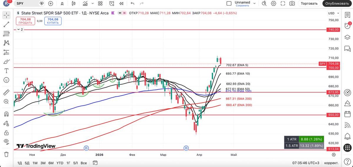 Цена также находится у максимумов, а широта снижается. Не удивимся продолжению красных дней, а также движению цены вверх. #spy #технический_анализ #америка #трейдинг_сша #фондовый_рынок #обзор #вывод #qqq #vix #smh #mags #xlk #ixic