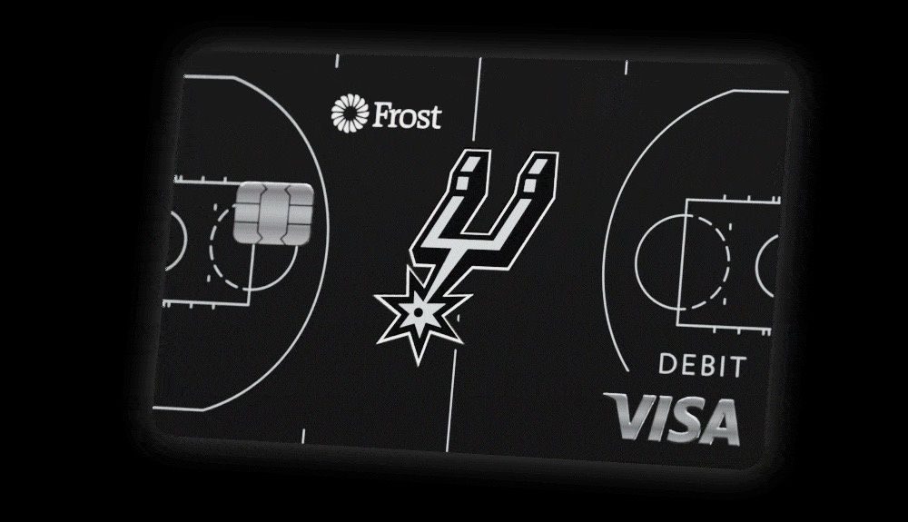 Интересный пример того, как дизайн банковской карты может выходить за рамки привычного платежного инструмента — коллаборация Frost Bank и баскетбольного клуба San Antonio Spurs.