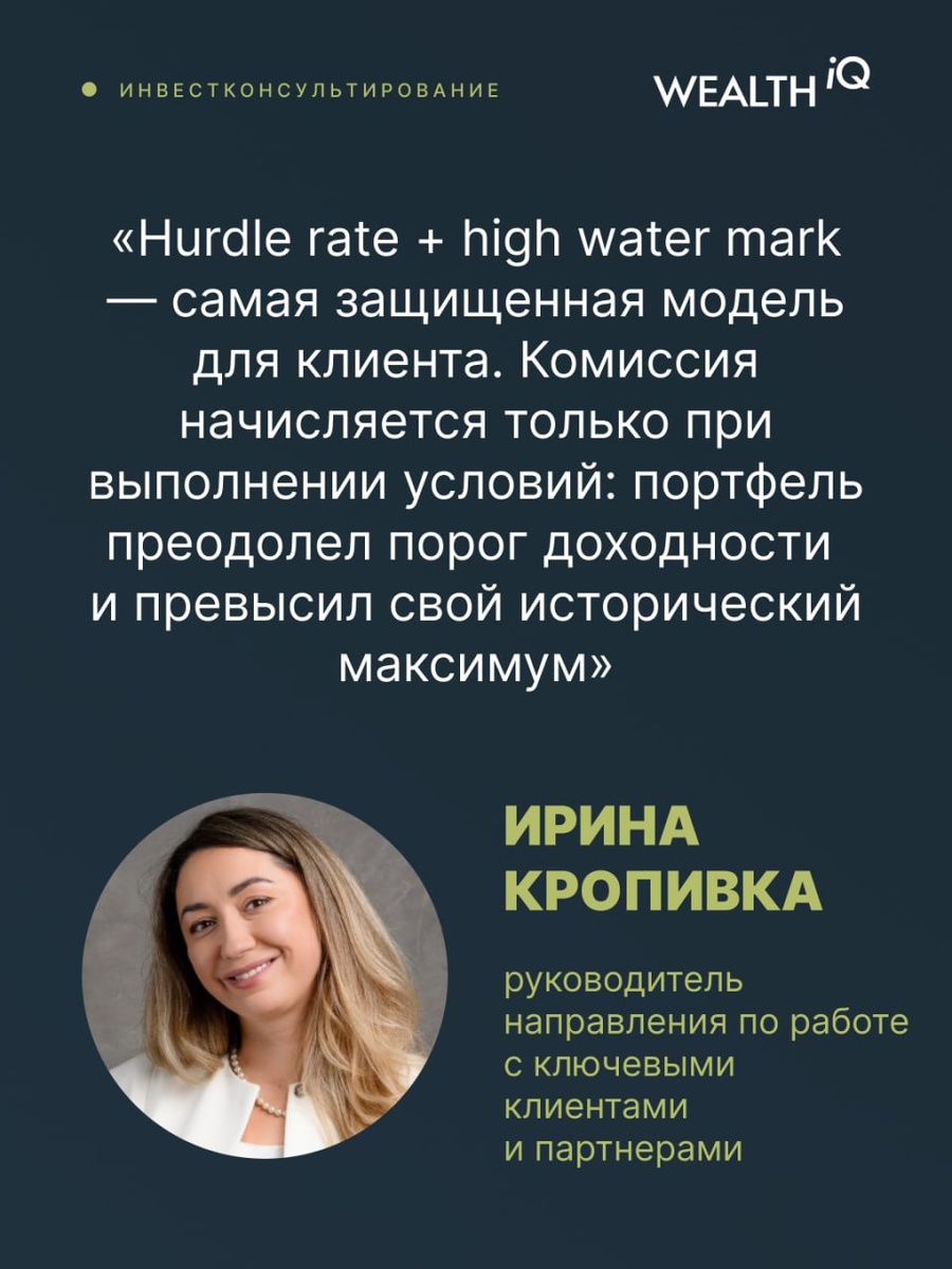 Как он работает? 💬 Ирина Кропивка, руководитель направления по работе с ключевыми клиентами и партнерами Wealth iQ Ранее мы разобрали базовые виды комиссий при инвестиционном консультировании. Сегодня поговорим о самом деликатном из них — success fee, или вознаграждении за успех. Именно здесь скрыта главная зона риска переплат и именно здесь важно знать о двух ключевых механизмах защиты — hurdle rate и high water mark (HWM). Как может быть устроен success fee — три распространенные схемы «гонорара за успех»: ▪Схема 1 Без защиты — комиссия начисляется с любого роста, даже если портфель просто отыгрывает прошлое падение. Клиент платит за восстановление, а не за реальный результат. ▪Схема 2 С hurdle rate комиссия берется только с прибыли сверх установленного порога доходности (например, выше 8% годовых). Все, что ниже этой планки, — работа консультанта без вознаграждения за успех. ▪Схема 3 С hurdle rate + high water mark — самая защищенная модель для клиента. Комиссия начисляется т