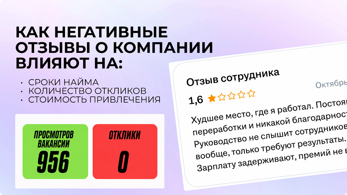 По данным исследований конца 2025 года, 86% соискателей изучают репутацию компании онлайн до того, как отправить отклик. 69% не готовы принять оффер от работодателя с плохой репутацией — даже если сидят без работы. А компании с негативным HR-брендом вынуждены предлагать зарплату на 10% выше рынка, просто чтобы привлечь кандидатов.
