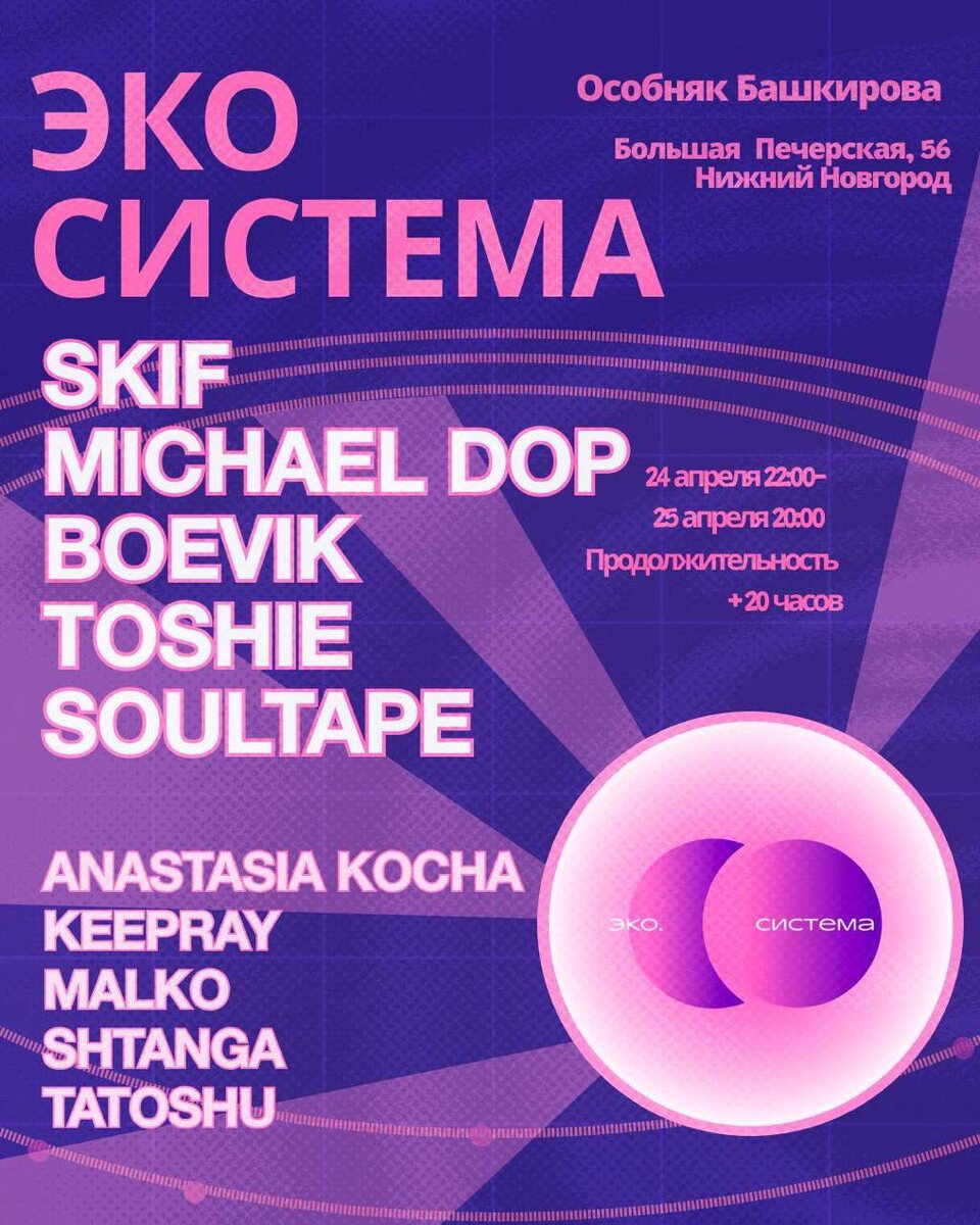 Уникальное для Нижнего Новгорода событие — ночная вечеринка и полноценный дневной рейв для тех, кто хочет послушать качественную электронную музыку в любое время суток. Все это в особняке на 400 м², где еще ни разу не проводились подобные мероприятия. ГЛАВНЫЙ ТАНЦПОЛ: именно здесь рождается пульс — мощный, качественный и разнообразный саунд для ценителей электронной музыки, плотный свет и танцпол, который не затихает. БАР И НАСТОЕЧНАЯ: стильная барная стойка с закусками, коктейлями и даже отдельная настоечная комната с вкусными спешл-напитками и авторскими рецептами. ЧИЛЛ-ЗОНА: комната для отдыха с аудиовизуальными перфомансами, мягким теплым светом и удобными пуфами для перерыва между танцами. В лайнапе диджеи из Москвы, Казани и других городов с эксклюзивными сетами из минимала, прогрессива и хауса: SKIF · Michael DOP · Boevik · Soultape · Toshie · Bypass · Pavel Gro · Anastasia Kocha · Shtanga · Malko · Keepray · Tatoshi 🎫 Билеты FC/DC 18+ 📆 24 апреля, 22:00 📍Дом купца Ба