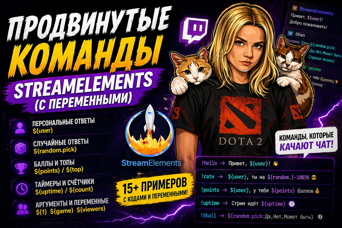 !hello → Привет, ${user}! Добро пожаловать на стрим 🔥 👉 Бот автоматически подставляет ник пользователя !rate → ${user}, я оцениваю тебя на ${random.1-100}% 😎 👉 Каждый раз разный результат !8ball → ${user}, ответ: ${random.pick:Да,Нет,Может быть,Спроси позже} !points → ${user}, у тебя ${points} баллов 💰 👉 Работает, если включена система Loyalty !top → Топ задротов: ${top.points} !viewers → Сейчас нас: ${viewers} 👀 !game → Сейчас стримим: ${game} !uptime → Стрим идёт уже ${uptime} При создании команды в настройках поставь: Пример: !discord → ${user}, заходи в Discord: https://discord.gg/xxx !fight → ${user} дерётся и... ${random.pick:побеждает 🏆,проигрывает 💀} !love → ${user} + ${1} = ${random.1-100}% любви ❤️ 👉 ${1} — это человек, которого указали в команде