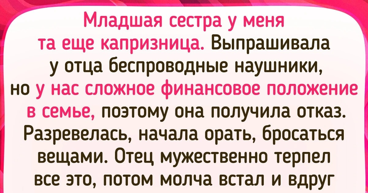 У каждого из нас найдется своя любимая история о папиной шутке, которая со временем стала неотъемлемой частью семейного фольклора. Такие моменты становятся не просто смешными воспоминаниями, а чем-то большим. Они остаются с нами на всю жизнь, передаются из поколения в поколение и напоминают, что даже в самых обыденных ситуациях можно найти повод для улыбки. Младшая сестра у меня та еще капризница. Выпрашивала у отца беспроводные наушники, но у нас сложное финансовое положение в семье, поэтому она получила отказ. Разревелась, начала орать, бросаться вещами. Отец мужественно терпел все это, потом молча встал, и вдруг взял ножницы и порезал проводные наушники сестры. После чего всунул их ей в руку со словами: «Вот. Беспроводные. Как ты и просила!» Я забивал гвоздь, и мой папа сказал: «Ты прямо как молния». Я подумал, что это комплимент, пока до меня не дошло — молния никогда не ударяет в одно и то же место дважды. Был случай в 90-х годах. Мне тогда было 8 лет. Родители купили машинку стир