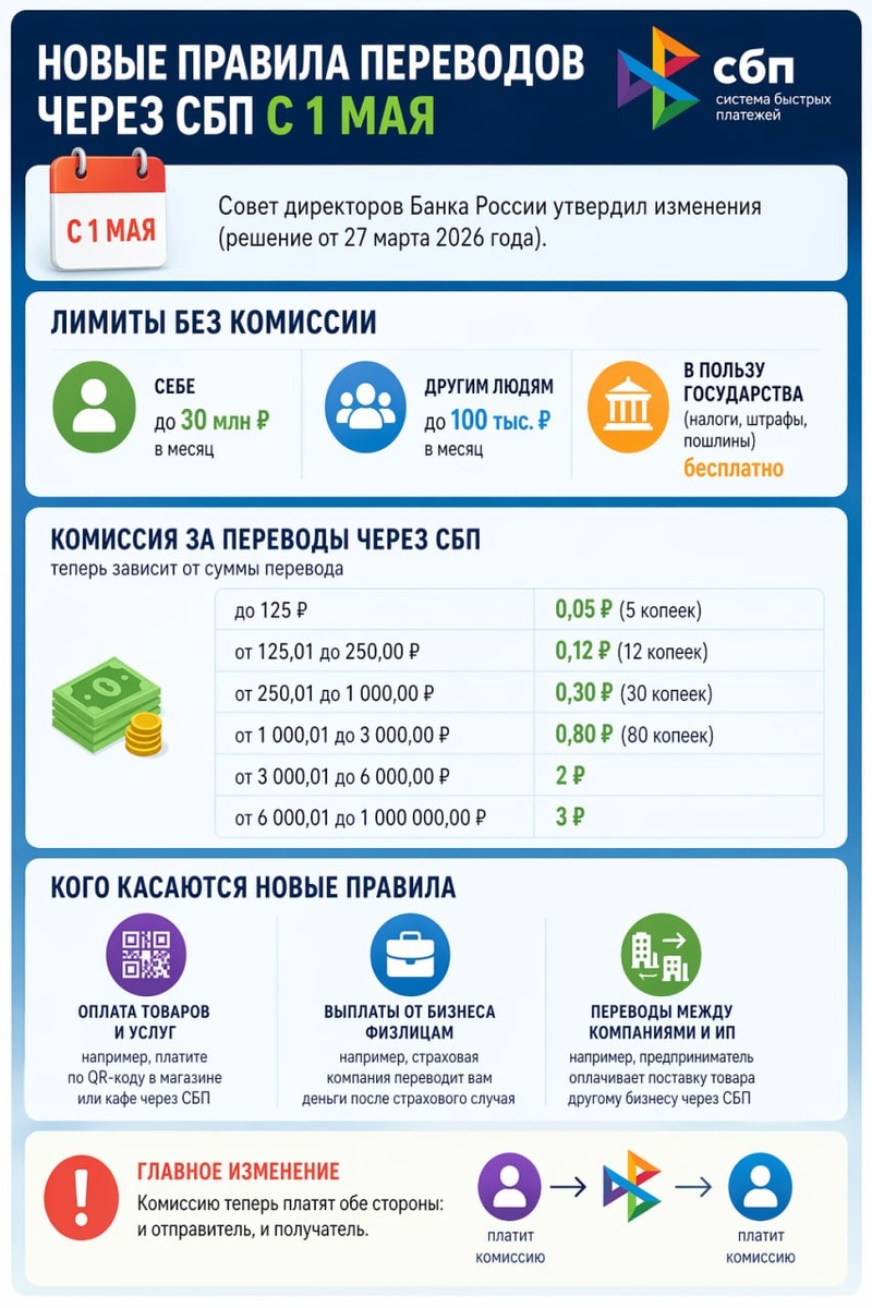 Совет директоров Банка России утвердил изменения (решение от 27 марта 2026): Лимиты без комиссии: ▪️ себе — до 30 млн ₽ в месяц ▪️ другим людям — до 100 тыс. ₽ в месяц ▪️ платежи в бюджет (налоги, штрафы, пошлины) — бесплатно Комиссия теперь зависит от суммы: ▪️ до 125 ₽ — 0,05 ₽ ▪️ 125–250 ₽ — 0,12 ₽ ▪️ 250–1 000 ₽ — 0,30 ₽ ▪️ 1 000–3 000 ₽ — 0,80 ₽ ▪️ 3 000–6 000 ₽ — 2 ₽ ▪️ 6 000–1 000 000 ₽ — 3 ₽ Кого касается: ▪️ оплата товаров и услуг (QR-коды) ▪️ выплаты от бизнеса физлицам ▪️ переводы между компаниями и ИП ⚠️ Важно: теперь комиссию платят обе стороны — и отправитель, и получатель. 📱 IVOL | Все контакты и проекты — здесь
