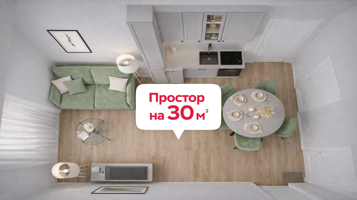 Чтобы уместить всё на 30 м², используйте эргономичную мебель и те зоны, которые обычно пустуют: