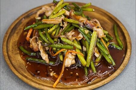 1. Зелёных побегов чеснока 400 г 2. Говядины 300 г 3. Лука 2 гол. 4. Морковь 1шт 5. Соевый соус 6. Растительное масло 7. Кунжут 8. Крахмал 9. Вода 10. Приправа «маласянь» Говядину нарежем небольшими прямоугольниками. На сковороде разогреем растительное масло и обжарим мясо до полуготовности. Лук нарежьте полукольцами, а морковь натрите на терке для корейской моркови. Добавьте овощи к мясу и жарьте, пока лук не станет прозрачным. Пока мясо и овощи готовятся, готовим соус. Я делала все на глаз: смешала соевый соус с водой, добавила приправу Маласянь, немного крахмала и кунжута. Отрежьте побеги чеснока от стрелок, нарежьте и отправьте в сковороду. Затем добавьте соус и готовьте на среднем огне около 10 минут. Готово! Угощайтесь!))