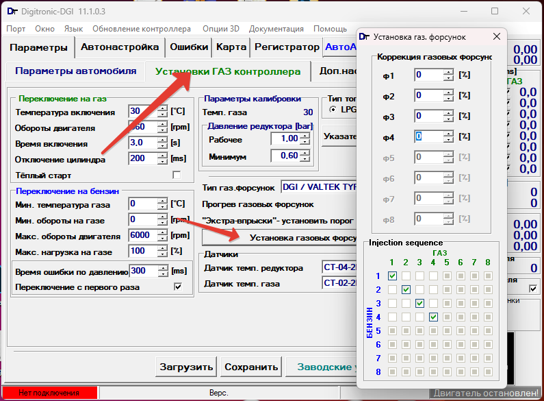 В программе Digitronic (версии Maxi, Evolution, IQ) индивидуальная коррекция по цилиндрам находится во вкладке «Установки ГАЗ контроллера» (кнопка «Установка газовых форсунок»). Важно понимать: программная коррекция — это костыль. Ее используют, если есть конструктивные особенности (разная длина шлангов) или небольшая разница в производительности, которую нельзя убрать механически. Как правильно подобрать значения (2 метода) Метод 1: По времени впрыска бензина (самый доступный) Этот способ позволяет выровнять цилиндры без спецприборов, основываясь на реакции штатного бензинового ЭБУ. Прогрейте авто до рабочей температуры и отключите все потребители (свет, кондиционер). В программе Digitronic найдите окно, где отображается время впрыска бензина по каждому цилиндру (если ваш блок и тип впрыска это позволяют видеть отдельно). Поочередно отключайте по одной газовой форсунке, переводя цилиндр на бензин (в программе это делается кликом на номер цилиндра). Смотрите на время впрыска бензина в