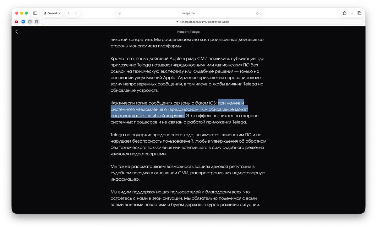 » Разработчик Telega подал заявление в ФАС и написал о этом в своем официальном ресурсе - ссылка В статье разработчик прямо пишет: Фактически такие сообщения связаны с багом iOS: при наличии системного уведомления о «вредоносном ПО» обновление может сопровождаться ошибкой загрузки. Разработчик настаивает на отсутствии вредоносного кода и требует проведения проверки в отношении Apple. Если для вас ситуация всё еще запутана: Приложение не является причиной ошибки при обновлении. Причиной является уведомление о наличии вредоносного кода. Но это уведомление относится к приложению Telega.