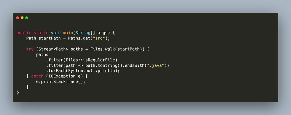 В Java есть удобный способ рекурсивно обойти все файлы в директории - метод Files.walk(). Он возвращает Stream<Path>, что позволяет легко фильтровать и обрабатывать файлы через Stream API. Пример - найти все .java файлы в папке src: import java.io.IOException; import java.nio.file.*; import java.util.stream.Stream; public class Main { public static void main(String[] args) { Path startPath = Paths.get("src"); try (Stream<Path> paths = Files.walk(startPath)) { paths .filter(Files::isRegularFile) .filter(path -> path.toString().endsWith(".java")) .forEach(System.out::println); } catch (IOException e) { e.printStackTrace(); } } } Что происходит: • Files.walk(startPath) - рекурсивно проходит по всем папкам • filter(Files::isRegularFile) - оставляет только файлы • endsWith(".java") - фильтр по расширению • forEach - обработка найденных файлов Это намного чище, чем писать собственную рекурсивную функцию обхода директорий. #Java #JavaDev #Programming ⚡️ Полезные ресурсы по Java 🚀