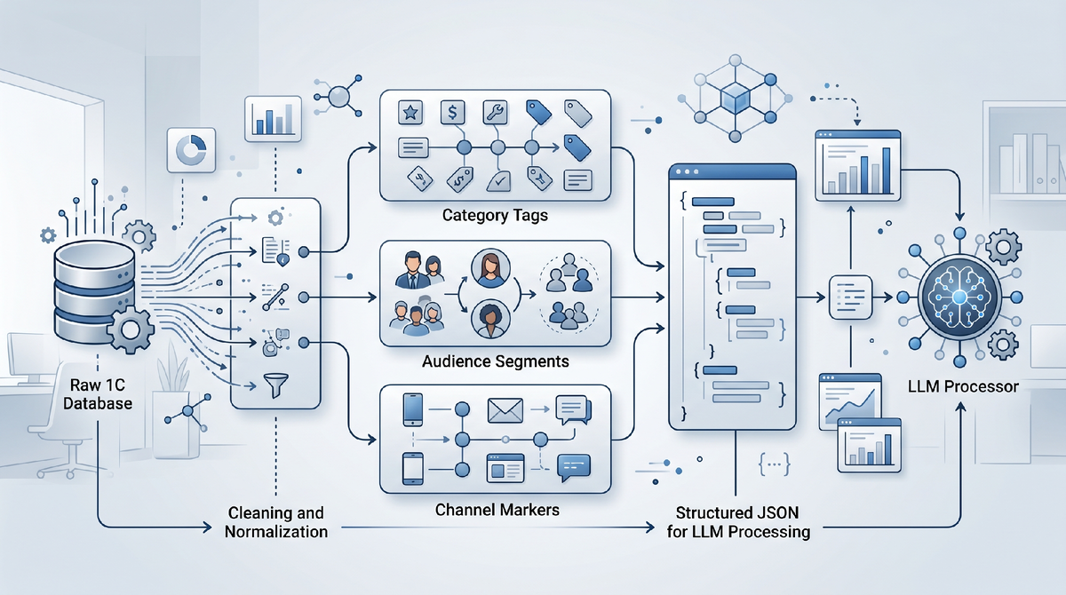 Перед запуском генерации зафиксировали критическое правило: сырые данные из 1С напрямую в LLM не отправляем. Построили трехуровневую сегментацию SKU: по категориям (игрушки, одежда, гигиена, питание), по целевому сегменту (возраст ребенка, pain parents, ценовая чувствительность), по каналу продвижения (маркетплейс vs собственный сайт vs соцсети). Для каждой когорты подготовили нормализованные JSON-файлы с обязательными и опциональными атрибутами, где каждое поле имело весовой коэффициент влияния на итоговый текст.