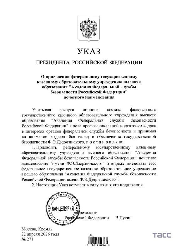 ⚡️ Владимир Путин присвоил Академии Федеральной службы безопасности имя Феликса Дзержинского. Радостно!