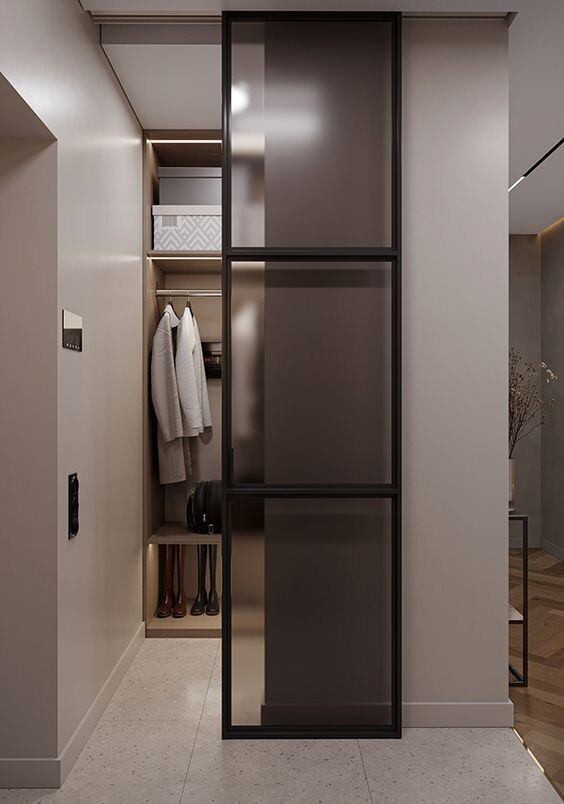 Прихожая — это часто самое узкое и темное место в квартире. Обычно дизайнеры стремятся сделать её максимально «невидимой», чтобы не загромождать пространство. Но на представленном фото мы видим смелое и очень эффектное решение: выделенная зона для хранения одежды, отделенная от остальной квартиры стеклянной перегородкой в стиле лофт. Это не просто шкаф, это полноценная микро-гардеробная, которая решает сразу несколько задач: организует хранение, зонирует пространство и задает стиль всему интерьеру. Давайте разберем, почему этот прием работает так хорошо и как его повторить. Главный герой этого интерьера — раздвижная перегородка с черным металлическим профилем и тремя секциями из тонированного (дымчатого) стекла. За стеклом скрывается продуманная система хранения. Обратите внимание, что здесь нет глухих фасадов — всё открыто. Пол в прихожей выложен керамогранитом с эффектом терраццо (светлый фон с мелкими цветными вкраплениями). Интерьер выдержан в благородных нейтральных тонах: Итог: