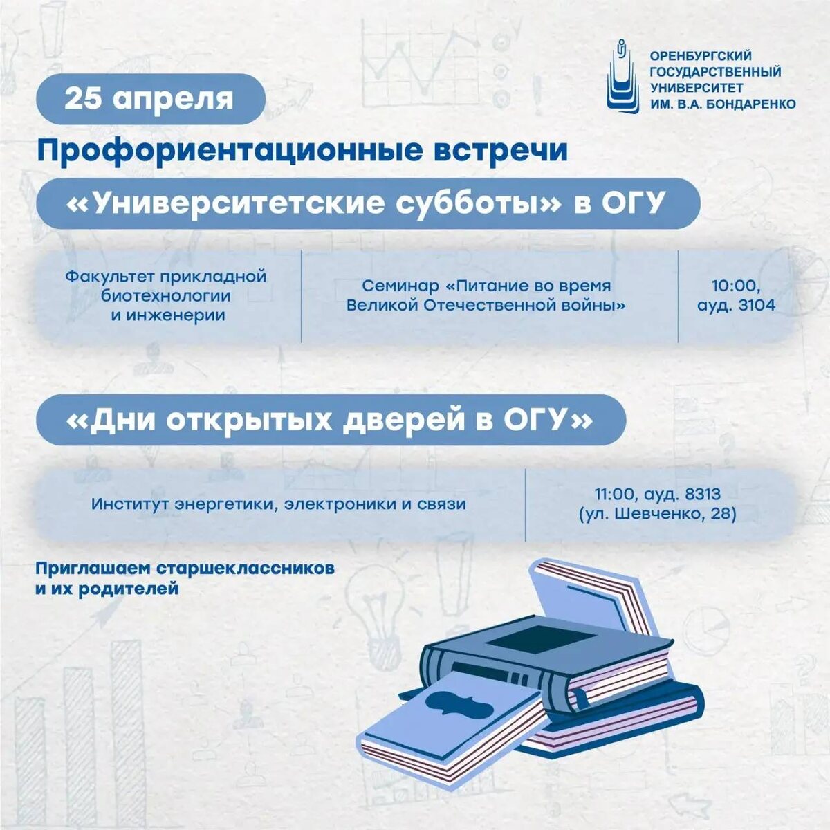 ⭐️ ОГУ имени В. А. Бондаренко приглашает школьников и родителей 25 апреля. Узнай о современных специальностях, задай вопросы преподавателям и почувствуй атмосферу студенчества. День открытых дверей: 📍 Институт энергетики, электроники и связи – в 11:00, аудитория 8313, улица Шевченко, 28. Университетские субботы: 📍 факультет прикладной биотехнологии и инженерии – семинар «Питание во время Великой Отечественной войны» в 10:00, аудитория 3104. ❗️ При себе обязательно иметь паспорт РФ. 📌 Полное расписание: www.osu.ru/doc/4182 📞 По вопросам участия: (35-32) 37-25-55. 🇷🇺 Мы в МАКС #ОГУ #в_ОГУ #OSU #УниверситетскиеСубботы