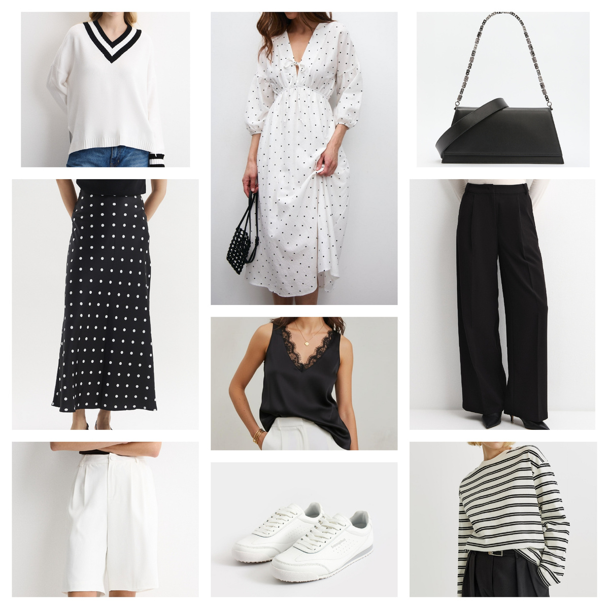 В основу капсулы может лечь один из стилистических приёмов или сразу несколько. В данном случае используем цветовой контраст — чёрного с белым, который идеально вписывается в современный минимализм. Также применяем ещё один способ сделать капсулу интереснее — сочетание нескольких принтов. Геометрия, горох и полоска — отличный вариант для стильного микса.