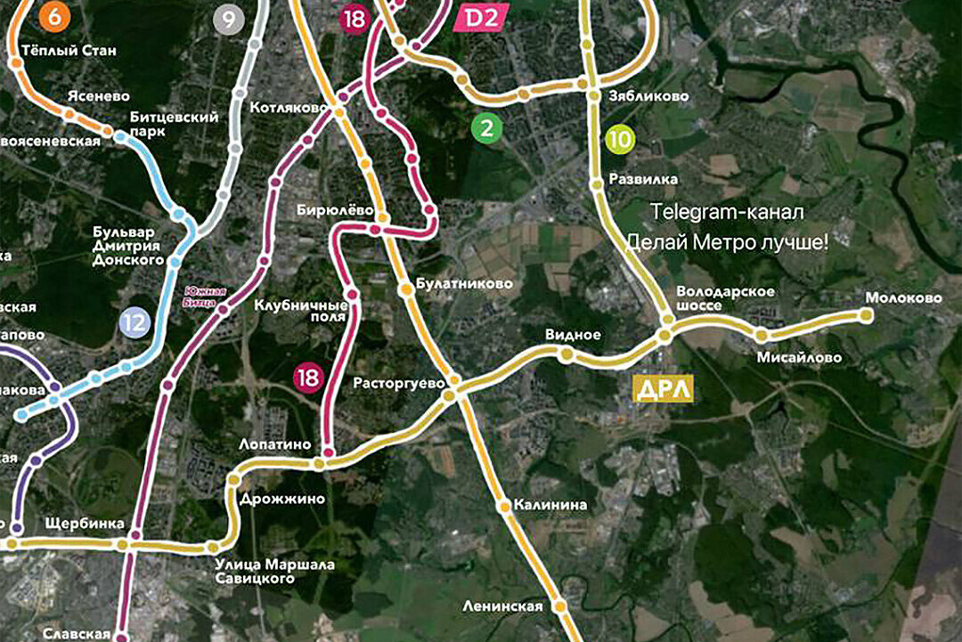 Тематические Telegram‑каналы, освещающие информацию о развитии московского транспорта, вновь делятся инсайдами о развитии метро после 2035 года. По их данным, теперь на официальном уровне обсуждается проект так называемой Дальней Рокадной линии метро (ДРЛ), которая протянется от аэропорта «Внуково» до села Молоково. В Ленинском округе на ней будут станции: «Дрожжино», «Лопатино», «Расторгуево», «Видное», «Володарское шоссе», «Мисайлово» и «Молоково». При этом на новой схеме конечная станция Бирюлёвской линии метро будет в деревне Лопатино, где будет пересадка на линию ДРЛ. На Бирюлёвской линии метро в Ленинском округе, в районе посёлка Измайлово, появляется ещё одна станция - «Клубничные поля». На новой схеме снова отображено продление Люблинско‑Дмитровской линии (салатовая ветка) - со станцией в посёлке Развилка и в северной видновской промзоне. Напомним, ранее обсуждался другой план развития - со строительством ответвления МЦД‑5 от станции «Бирюлёво‑Товарная» в сторону видновской пр