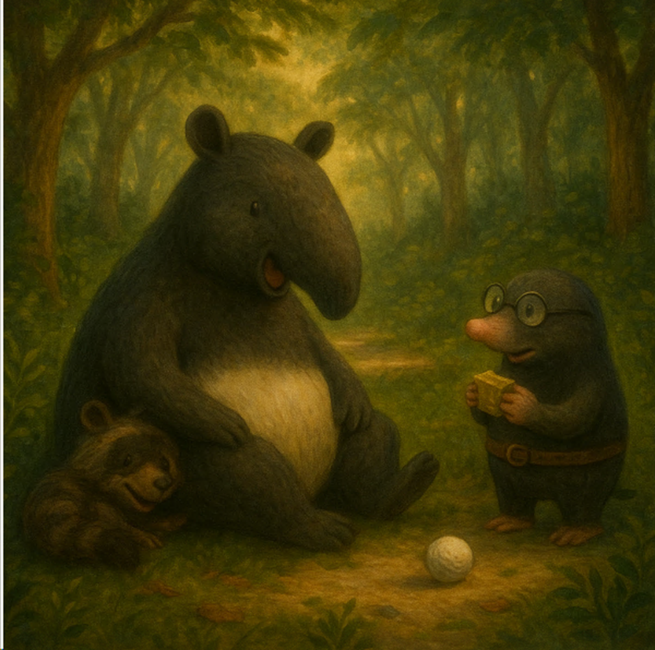 Тапир шёл по лесу и наткнулся на кусты с тремя белыми кругляшками. Рядом крутилась Кура Га — местная курица с задумчивым взглядом и пером набок. Она подошла к кусту, посмотрела на шарики, вздохнула… и ушла по делам. Куда-то, уверенно. Тапир смотрел ей вслед. Потом на шары. Потом на куст. — Ну… понятно. Яйца. Ушла. Надо сидеть. Всё логично. Он сел. Аккуратно, уверенно, слегка распластавшись. — Буду выводить, — сказал он себе. — Надо же кому-то. ________________________________________ Прошло два дня. Тапир сидел, не двигаясь. Пил воду через соломинку. Кротон приносил еду. На лопате, чтобы не тревожить атмосферу. — Всё хорошо? — спрашивал Кротон. — Температура держится. Пульс нормальный. — отвечал Тапир. — Я в процессе. На второй день появился Енот. — А чё это ты такой… тёплый и уютный? И попытался устроиться в боковую складку Тапира. — Енот, не сейчас. Я — гнездо! — Ну ты гнездИще! — восхитился Енот и полез ещё сильнее. Тапир заволновался. Шевельнулся. Один "яйцо" выкатилось. Покатилось