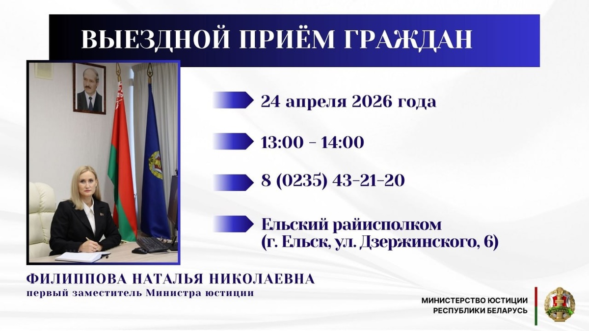 ☎️☎️☎️☎️☎️☎️☎️☎️ 🗓 24 апреля 2026 года с 13:00 до 14:00 первый заместитель Министра юстиции Республики Беларусь Филиппова Наталья Николаевна проведет выездной прием граждан в Ельском районном исполнительном комитете (г. Ельск, ул. Дзержинского, 6) по вопросам, относящимся к компетенции Министерства юстиции. 📞 Предварительная запись на прием будет осуществляться через Ельский райисполком по телефону: 8 (0235) 43-21-20. 💪💪💪💪| Сайт | Telegram | Instagram | YouTubе
