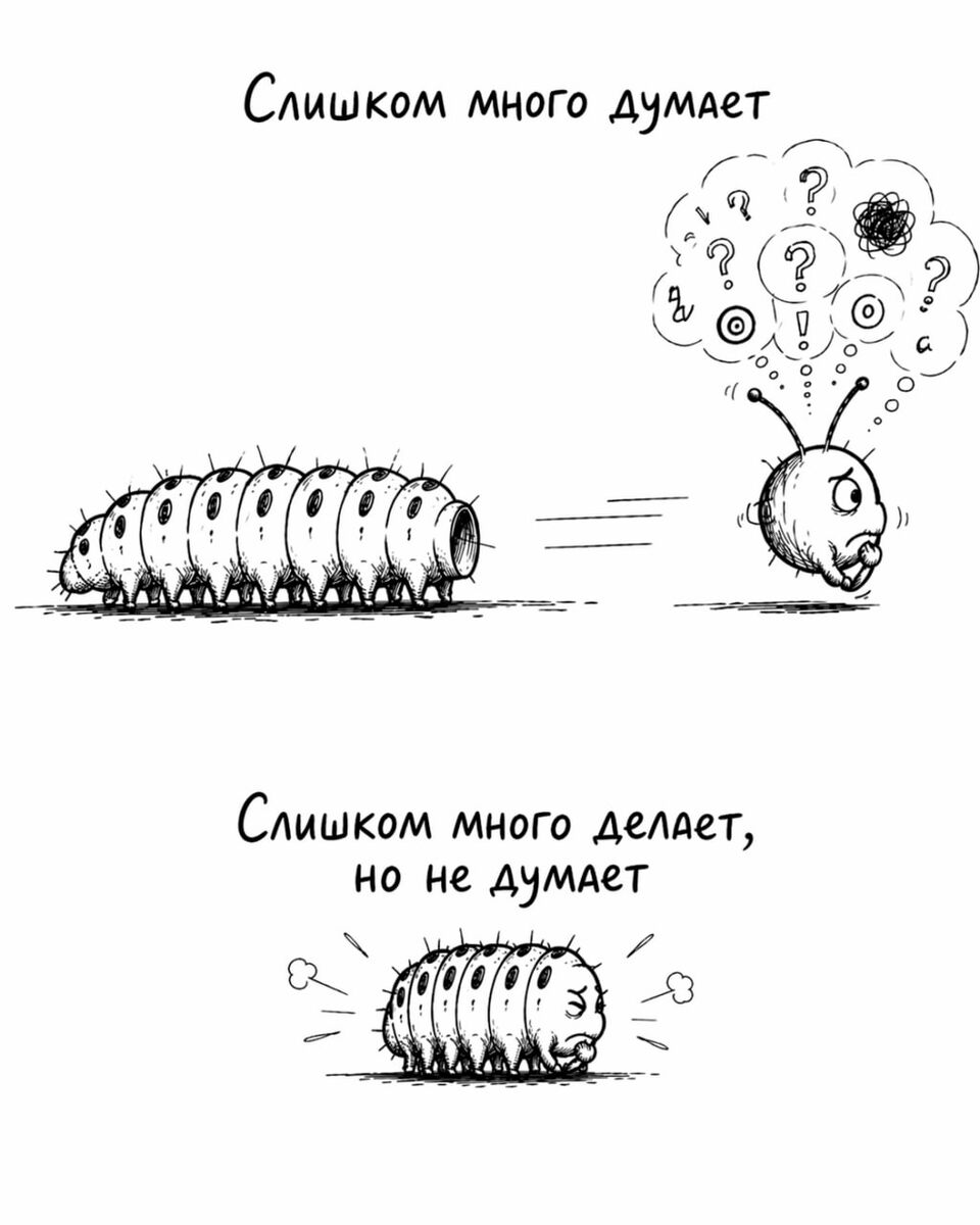 ". Помню, был в Белгороде на конференции, где выступал Дорофеев. И он там объяснял на гусеницах, что есть 2 патологии: - если гусеница (то есть мы с вами) много думает, потребляет информацию, но ничего не делает - у неё отрывается голова - если гусеница только делает, но не думает - она сплющивается Чтобы гусеница нормально двигалась, ей нужно чередовать: подумать, что-то сделать, подумать, что-то сделать. Я стараюсь соблюдать этот баланс, но иногда всё-таки впадаю в перфекционизм. Начинаю думать, что прежде чем что-то сделать, нужно сначала изучить ещё кучу всего. И в итоге, если объяснять на примере гусеницы, голова снова отрывается. Как ни крути, в эпоху ИИ это стало ещё заметнее. Ценность информации снизилась, всё теперь доступно почти мгновенно, бери и делай, но я продолжая следовать старому паттерну, хотя по сути двигаться можно гораздо быстрее. К сожалению, оригинальную картинку не нашёл, поэтому сгенерил свою для наглядности в ChatGPT. А видео с объяснением Дорофеева можн