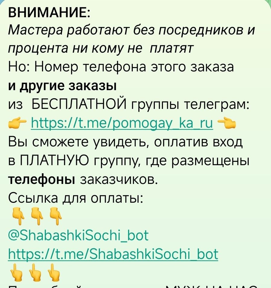 : Залить кабинеты 4 шт общ площадь 100 кВ м Материал м300 готовая смесь Работа в Красноармейском районе Цена за кв м 700 Отдаю 100 кВ дальше могу предложить плитку и гкл и тд Слой 3 см Сочи, улица Горького, 56 Сергей ВНИМАНИЕ: Мастера работают без посредников и процента ни кому не платят Но: Номер телефона этого заказа и другие заказы из БЕСПЛАТНОЙ группы телеграм: 👉 https://t.me/pomogay_ka_ru 👈 Вы сможете увидеть, оплатив вход в ПЛАТНУЮ группу, где размещены телефоны заказчиков. Ссылка для оплаты: 👇👇👇 @ShabashkiSochi_bot https://t.me/ShabashkiSochi_bot 👆👆👆 Подробней о вакансии МУЖ НА ЧАС В СОЧИ: на сайте компании "100 услуг Сочи": Для мастеров: https://pomogay-ka.ru/ Для клиентов / заказчиков услуг: https://pomogay-ka.ru/ Ватсап: +7-918-608-69-29 Телеграм: +7-988-231-68-77 @Andrey220280 💥💥💥💥💥💥💥💥💥