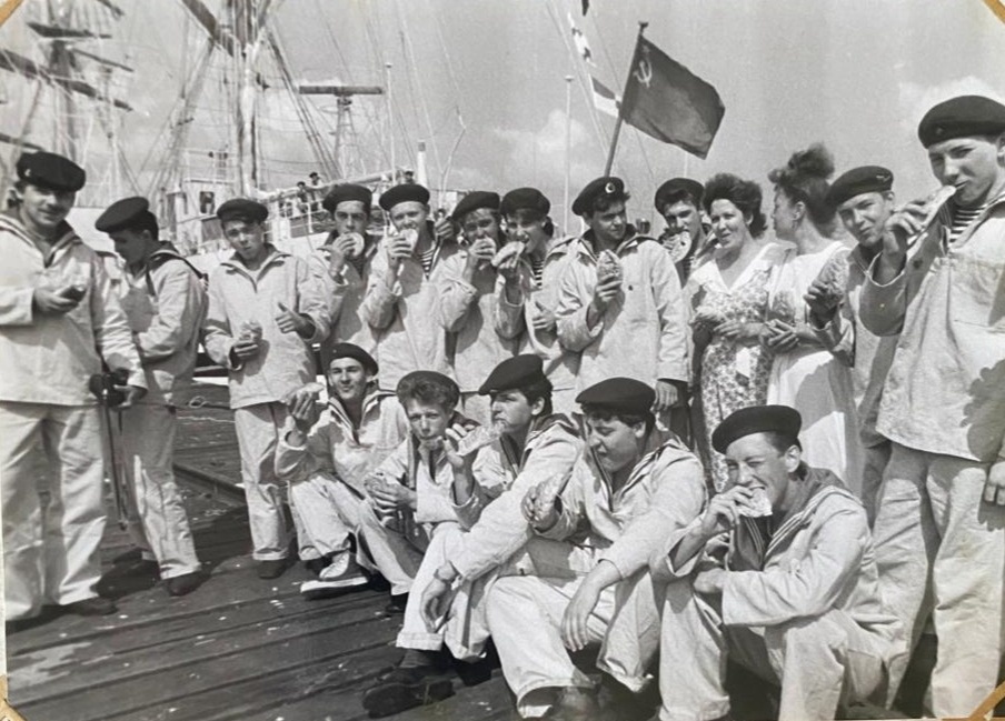 В один из дней стоянки на борт поднялась одна из этих дам и обратилась к курсантам с необычной просьбой: сделать несколько совместных снимков для рекламы местной кондитерской. Ребята охотно пошли навстречу. Фотосессия, что называется, прошла на ура — ведь к ней совершенно бесплатно прилагались вкуснейшие пирожки. Несколько фотокарточек на память тогда передали самим ребятам, и многие из них до сих пор бережно хранятся в личных альбомах.