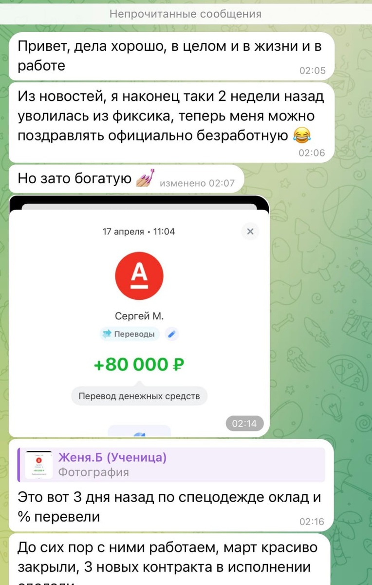 А вот с таких приятных сообщений от учеников) Старички в канале могут помнить Евгению 👉🏻 Рассказывала о ней здесь Если кратко, Евгения работала администратором в FixPrice, получала 35.000 рублей и хотела найти дополнительный источник дохода. Так пришла к нам на обучение тендерным специалистом Первого клиента нашла через холодные рассылки (писала отклики компаниям). Сделала 15 откликов, ответили трое, и с одним клиентом начала работать Так первым клиентом стало производство спецодежды. Сначала Евгения получила 30.000 рублей авансом, потом клиент оплатил еще 40.000 рублей. В итоге Женя заработала в первый месяц — 70.000 рублей А сейчас вот поделилась новостью — уволилась из FixPrice и теперь работает только тендерным специалистом 💡Клиент остался тем же — производство спецодежды, получила свою зп + % и заработала 80.000 рублей. При этом работает по 4-5 часов в день Вот так тоже частенько бывает у наших ребят) Начинают с поиска доп дохода, а потом делают тендеры своим основным источник