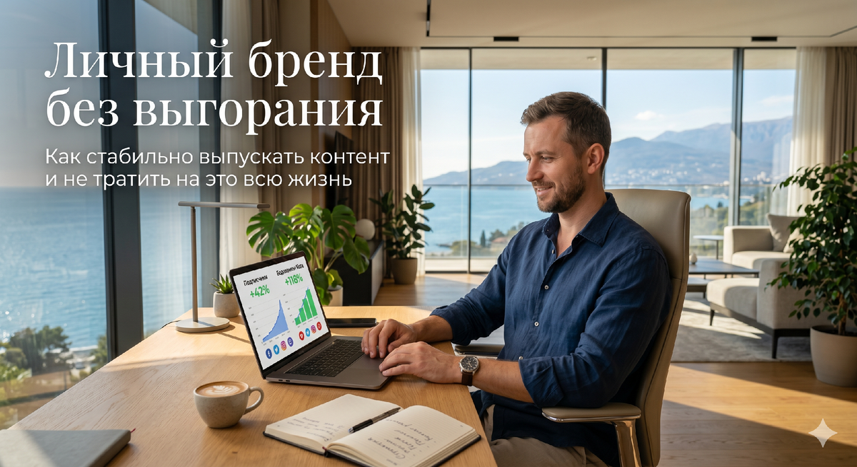 Три года назад я сидел на веранде с видом на Черное море и с ужасом смотрел на пустой экран ноутбука. Мой собственный блог простаивал неделями. Знакомый SMM-специалист запросил 70 тысяч рублей просто за то, чтобы писать сухие тексты от моего имени. Я тогда жестко выгорел, пытаясь совмещать ведение клиентских проектов и развитие своего имени в сети. Я осознал, что ручной труд в соцсетях - это прямая дорога к нервному срыву. Ниже расскажу про личный бренд: как регулярно выпускать контент простым языком. Без воды, опираясь на свои 10 лет практики. Вы узнаете: как выстроить доверие аудитории, где брать идеи для постов, зачем нужна автоматизация и как нейросети спасают бюджеты предпринимателей.