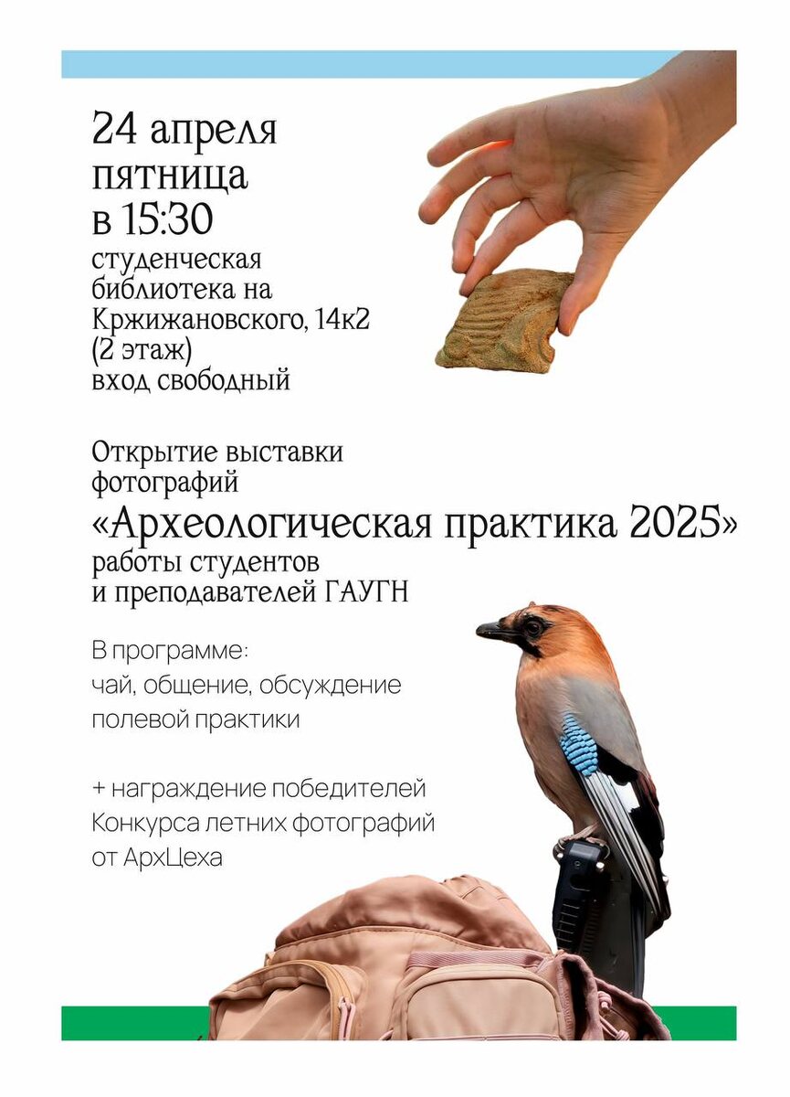 » 📸 24 апреля Студенческое научное общество направления «Археология» приглашает всех желающих на открытие выставки фотографий студентов и преподавателей ГАУГН «Археологическая практика 2025». Скоро лето и новая практика! Самое время вспомнить, как она проходила в прошлом году! 📆 Дата и время: 24 апреля в 15:30 📍 Место проведения: ул. Кржижановского, 14к2, 2 этаж, Студенческая библиотека. В программе: ☑️ наслаждение фотографиями ☑️ неформальное общение с чаем и обсуждение сюжетов ☑️ вручение призов участникам, призёрам и победителям Внимание: если вы не студент ГАУГН или сотрудник ИА РАН, то для получения пропуска просьба написать ФИО в сообщения руководителю СНО - Анне Зиганшиной. 💻 Также будет организован Яндекс-Телемост для тех, кто хотел бы присутствовать в онлайн формате. ⭐️ Не стесняйся приходить, если ты абитуриент ГАУГН! Это отличная возможность узнать, как проходит летняя археологическая практика! #археологиГАУГН #простРАНство_ГАУГН #фотовыставка #gaugn_event 👻