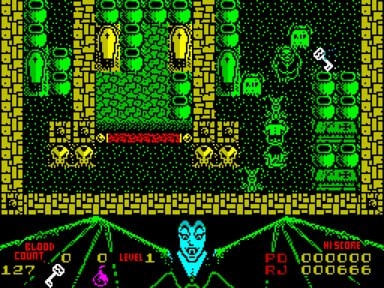 Weems and the She Vampires Бывший укротитель львов, а теперь охотник на вампиров мистер Уимс врывается в шестиэтажный особняк-лабиринт. Вооружён чесночным пистолетом и одной умной таблеткой. На каждом уровне нужно собирать оружие (кол, молоток, мега-чеснок, зеркало, распятие) — иначе финальную Великую Вампиршу не победить. Вокруг летучие мыши, монстры Франкенштейна и хитрые вампиры. Помогают бутылки с кровью и чесночные бомбы (очистка экрана). Мешают скрытые двери и телепорты. После победы над боссом особняк придётся покидать под атаками разъярённой нежити. В настройках: длина клыков (1–3) — чем длиннее, тем быстрее высасывают кровь. Управление: клавиатура или джойстик (Kempston, Interface II). Жёсткий экшн с чёрным юмором для тех, кто не боится рисовать карты лабиринтов. 🕹Играть онлайн