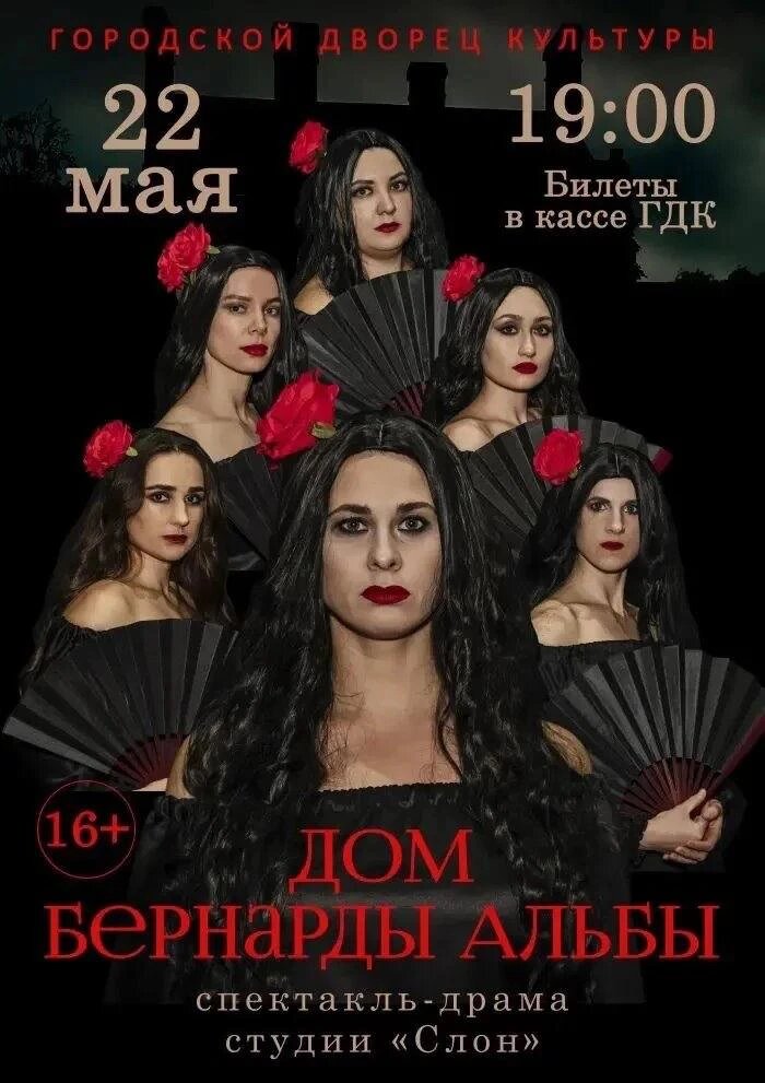 22 мая в 19:00 на сцене Городского дворца культуры (ГДК) в Азове — спектакль-драма «Дом Бернарды Альбы» в исполнении студии актерского мастерства «Слон». Постановка создана по мотивам знаменитой пьесы Федерико Гарсиа Лорки Действие разворачивается в Испании начала XX века. В доме властной Бернарды Альбы живут пять её дочерей и старуха-мать. Строгие запреты и патриархальные устои превращают семейное гнездо в тюрьму для женщин, где любые проявления чувств считаются грехом. Однако страсть и желание свободы постепенно разрушают стены «монастырской» крепости. Спектакль рассказывает о борьбе за право любить и о том, на что способны женщины, лишённые возможности чувствовать. Продолжительность — 1 час. Возрастное ограничение: 16+. Цены на билеты: 300, 500 и 600 рублей. Продажа ведётся в кассе ГДК с понедельника по пятницу с 14:00 до 19:00. Касса ГДК — 8 (8634) 24-00-39
