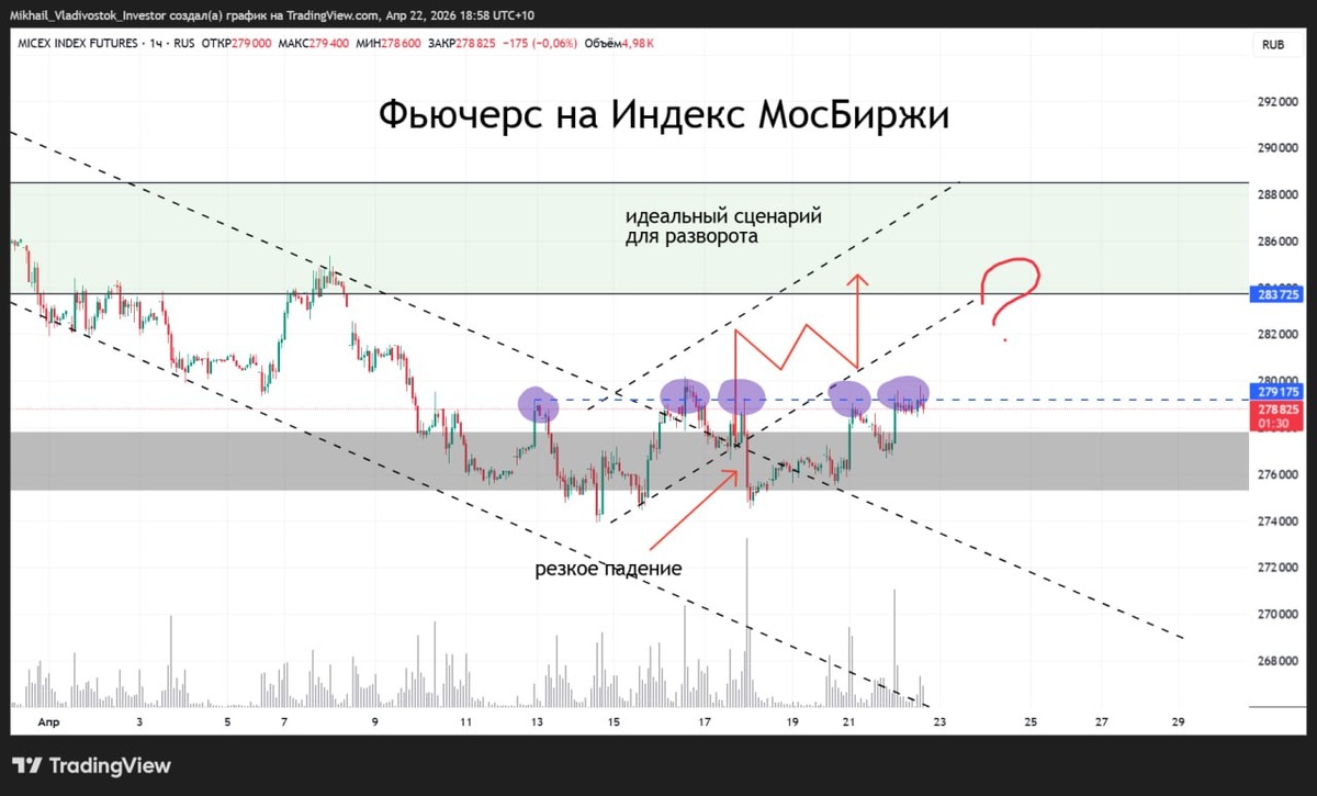 Давайте посмотрим на фьючерс Индекса МосБиржи под микроскопом $MXM6 Таймфрейм 1 час Обратите внимание, что мы шли внутри нисходящего канала. Потом была попытка выйти из него и мы вновь ударяемся о тот же уровень в районе 279000 и отскакиваем. Снова попытка и резкое падение. Так вот откуда резко упали, нам необходимо выделить эту зону. И каждый раз при подходе видим реакцию продавца. По итогу 5 попыток выделил маркером. Для дальнейшего похода вверх необходимо пробивать 279000 и закрепляться. Всё что ниже - это риск снижения 🤷♂️