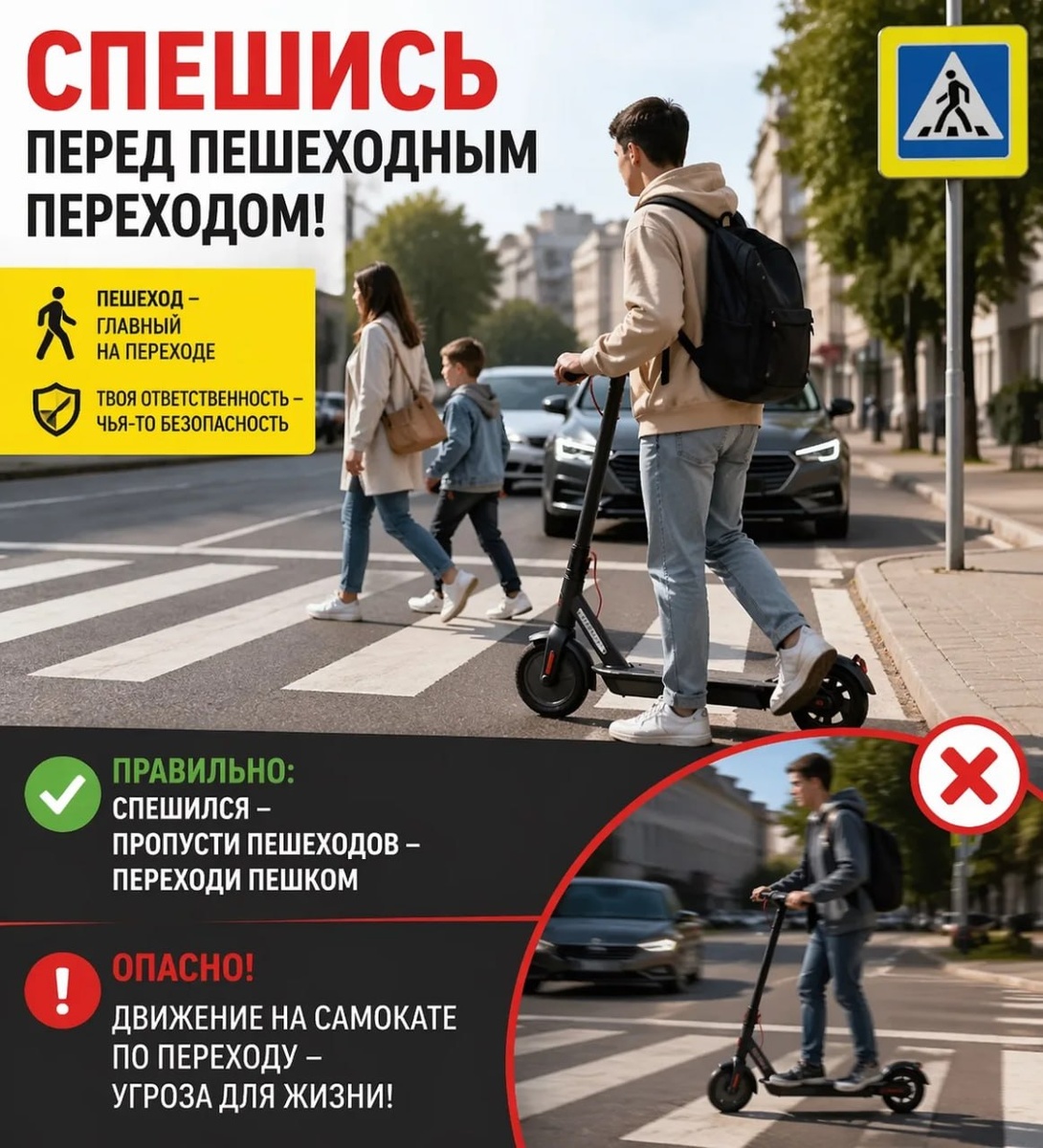 ️⃣ 🏛 Полиция Анапы призывает спешиваться перед пешеходным переходом! 🚔 При выезде на пешеходный переход на скорости водитель автомобиля физически не успевает среагировать. Самокат появляется в зоне видимости слишком быстро, и даже при соблюдении правил водителем риск наезда резко возрастает. 👮♂️ Именно поэтому важно: перед переходом обязательно спешиться и перейти дорогу пешком, ведя самокат рядом. Помните: — автомобиль не может остановиться мгновенно; — скорость самоката создаёт эффект «внезапного появления»; — одна ошибка может привести к серьёзным последствиям. 🪄 Пешеходный переход — это безопасное пространство только при условии, что вы переходите его пешком. 📲Полиция Анапы в МАХ 🌐 Полиция Анапы 🌐 ВК 🌐 ОК 🌐 Rutube 🌐 Дзен