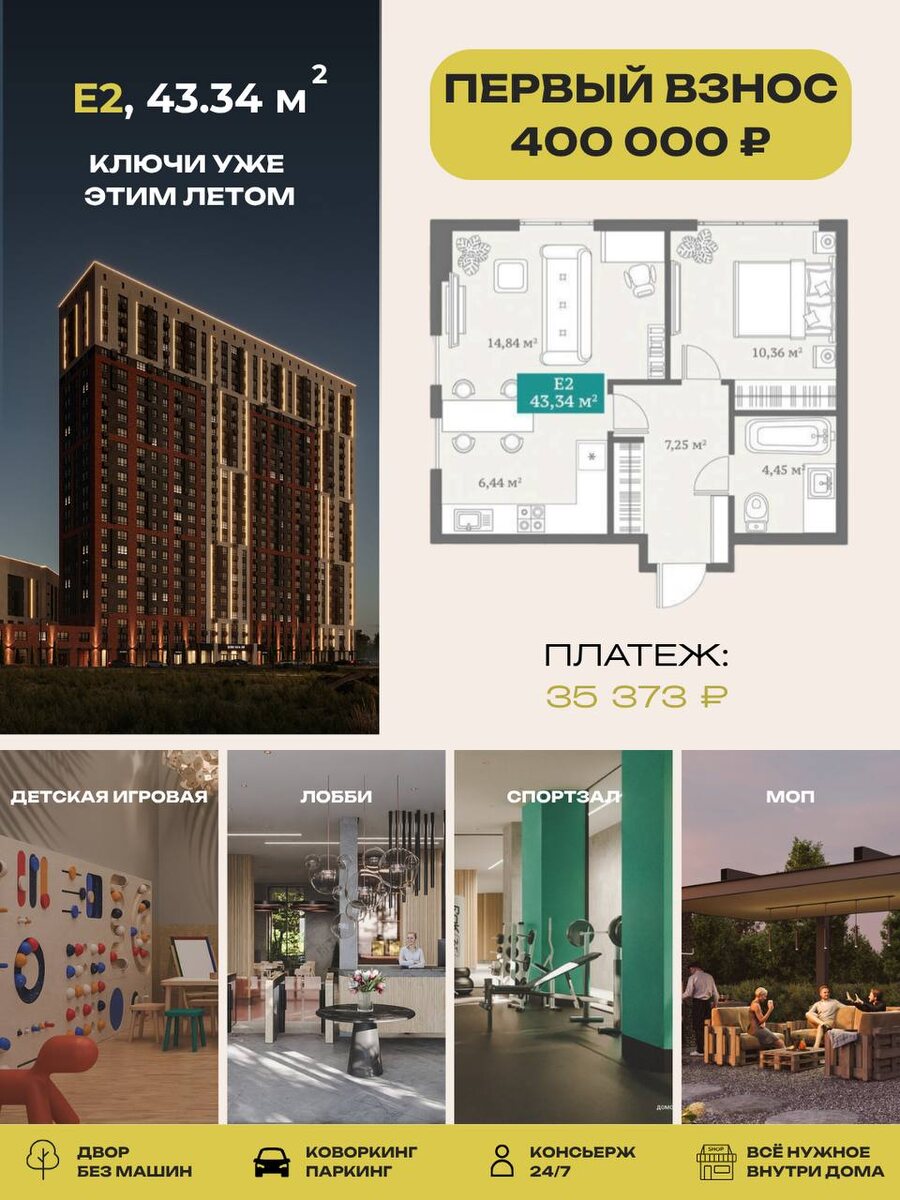 Тут сразу совпало несколько важных вещей: 📏семейная ипотека 6% 📏первый взнос от 300 000 ₽ 📏и ключи уже этим летом Плюс сам проект очень классный по наполнению: лобби, консьерж, кафе, коворкинг, спортзал, двор без машин и всё, что делает жизнь внутри дома реально удобной. Подборку с квартирами уже выложила в базу квартир Переходите смотреть, пока такие варианты ещё есть.