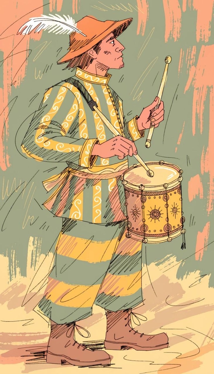 A graphic illustration of a Medieval man playing a single medieval drum with wooden drum sticks beating the drum