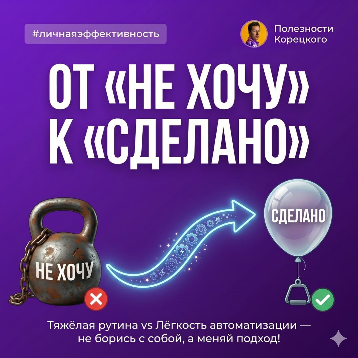 У меня есть два метода, которые помогают справляться с задачами из категории «не хочу, но надо». Метод 1. Обмануть мозг Например, я терпеть не могу утреннюю зарядку. Но я нашёл лазейку: ставлю перед собой iPad с полезным видео на YouTube. Мозг уверен, что мы просто смотрим контент и отдыхаем, а тело в это время механически выполняет нужные упражнения. Метод 2. Делегировать ИИ-агентам Я веду базу знаний в Notion по системе PARA. Идея простая: всё интересное летит в общий Inbox. Но потом раз в неделю эту кучу нужно вручную разбирать и сортировать. Занятие скучное, но без него вся система быстро превращается в свалку. Вместо того чтобы заставлять себя, я настроил нейро-агента. Теперь он сам превращает сырые наброски в структурированные заметки и автоматически раскладывает по нужным папкам второго мозга. 🔄🔄🔄 #продуктивность Спасибо🔴Чат🔴Особняк🔴Автор