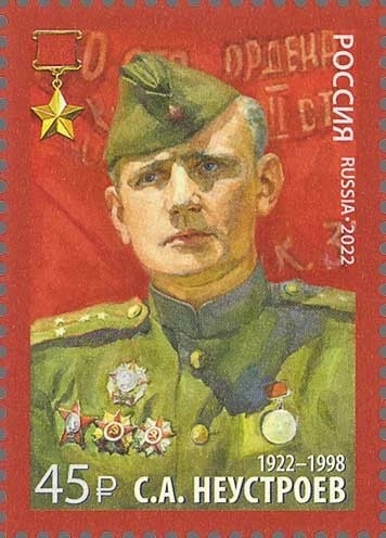 Водружение Красного знамени над рейхстагом – великий исторический момент, поставивший точку в самой кровопролитной войне всех времён. С этим событием неразрывно связаны имена красноармейцев Михаила Егорова и Мелитона Кантарии, однако не менее важна роль их батальонного командира Героя Советского Союза Степана Неустроева, руководившего штурмом главного входа в рейхстаг и наречённого в народе «комбатом Победы». Фигура Степана Андреевича имеет непосредственное отношение к истории нашего ведомства: после войны он долгое время служил во внутренних войсках МВД СССР. Одним из мест его службы в 1950–1960-е годы была воинская часть в городе Лесном Свердловской области, существующая по сей день и выполняющая задачи в составе Росгвардии. В 2022 году в оборот была выпущена почтовая марка тиражом 120 тыс. экземпляров, посвящённая 100-летию со дня рождения «комбата Победы». Её иллюстративную основу составил портрет, запечатлевший Степана Андреевича в звании капитана в один из дней победной весны 194