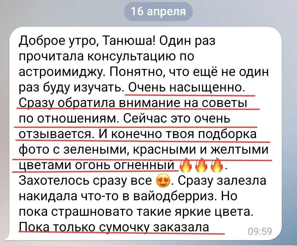 ! ☀️ Огромное спасибо за такой тёплый и душевный отзыв — прочитала его с улыбкой и лёгким трепетом в сердце! 💜 Очень рада, что консультация по астроимиджу нашла такой живой отклик, особенно в теме отношений — это действительно важная сфера, и здорово, что удалось подсветить точки роста именно через призму стиля. — Про цвета - это так по‑женски: сначала «огонь, хочу всё!», а потом чуть‑чуть осторожности! 😅 Но знаешь, мне кажется, ты сделала идеально: начать с яркой сумочки — это как раз тот самый мягкий вход в новое. — Ты очень точно подметила про страх "начать носить яркие цвета". Да, неизведанное всегда немного настораживает — это нормально. Но важно помнить: не обязательно менять всё сразу. Можно двигаться маленькими шагами, примерять новое постепенно, прислушиваться к себе. И тогда эти яркие цвета, новые образы и внутренние перемены начнут складываться в красивую, гармоничную картину — твою личную историю стиля и уверенности. — Информации много — целых 45 листов А3! Но это не