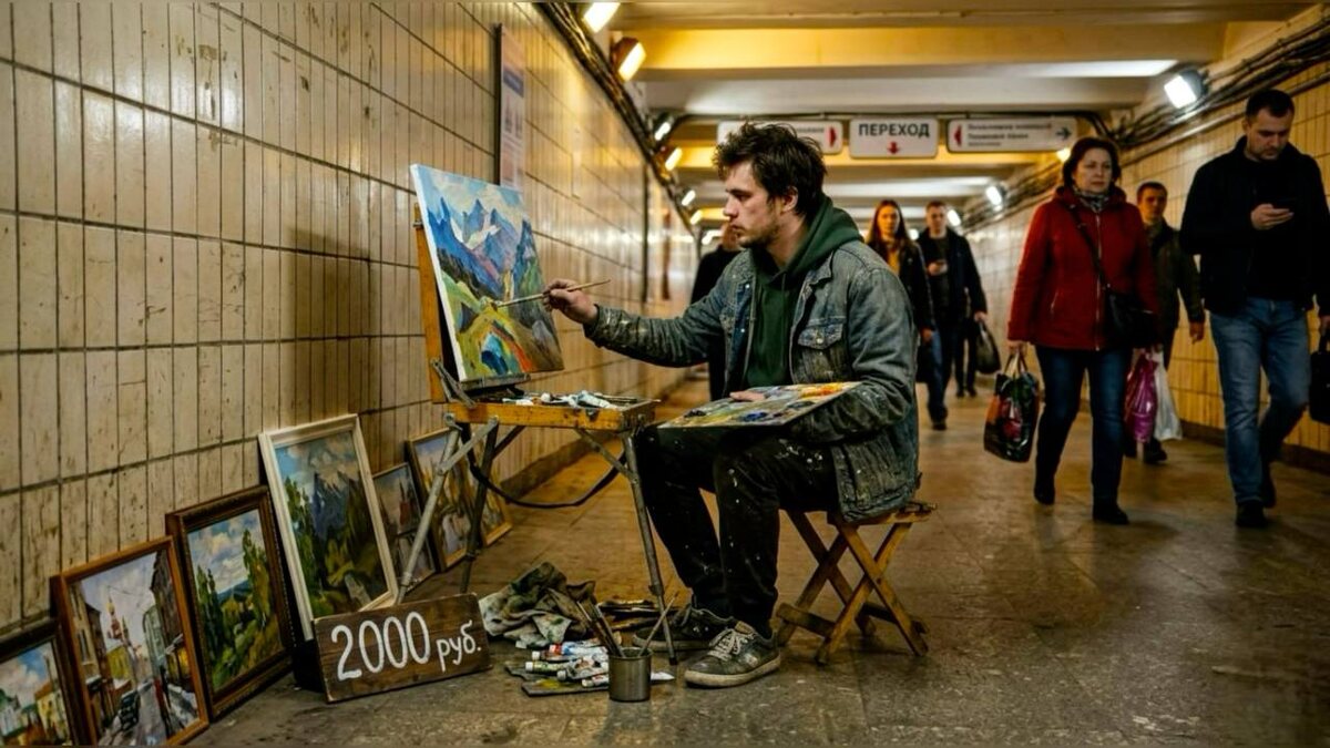 Он начал рисовать копии известных картин. Ван Гог, Моне, Айвазовский – брал репродукции, садился за мольберт и рисовал. Неделя – и готова одна картина. Потом он брал её, шёл в переход у метро, ставил на мольберт и продавал.