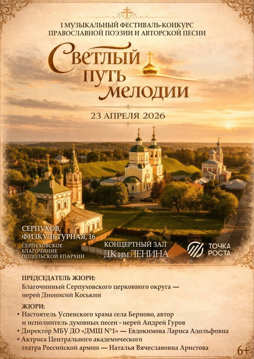 » Приглашаем талантливых авторов, исполнителей, хоровые коллективы, вокальные ансамбли, поэтов и чтецов Тема: православная поэзия и авторская песня. ▫️участие бесплатное; ▫️заявки принимаются до 20апреля 2026года включительно на эл. адрес: dk.tochkarosta@mail.ru 🚫 Возраст: 6+ 📆 23.04.2026 🕒 11:00 🏢 ДК им. В.И. Ленина 📍 г. Серпухов, ул. Физкультурая, д.16 💰 Вход свободный❗️ ⭐Поддержать канал голосом 💰 Канал Вакансии Серпухова ✅ Мероприятия Серпухов https://dzen.ru/id/66f01c6eb4c6fe60c9ca1608 https://vk.ru/serpukhov_events http://dzen.ru/serpukhov_events