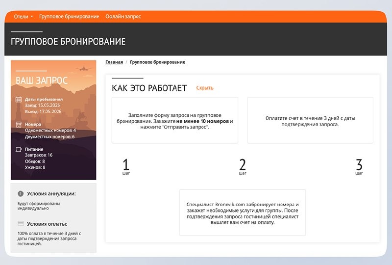 🔴 Bronevik.com запустил сервис группового бронирования ❗️Платформа Bronevik.com расширила линейку сервисов для делового туризма, запустив услугу группового бронирования. Решение предназначено для агентств и компаний, которым необходимо организовать размещение групп – для командировок, деловых мероприятий и туристических поездок. 📍Сервис обеспечивает подготовку группового размещения «под ключ». Для этого клиенту необходимо в специальном разделе личного кабинета или по электронной почте указать количество гостей, локацию, требования к номерам и дополнительные услуги, после чего Bronevik.com подбирает подходящие варианты, ведет коммуникацию и документооборот со службами размещения в отелях, а также при необходимости вносит изменения в уже созданные бронирования.... 📌 Подробнее на Welcome Times по ссылке. Welcome Times: САЙТ | TG | ВК