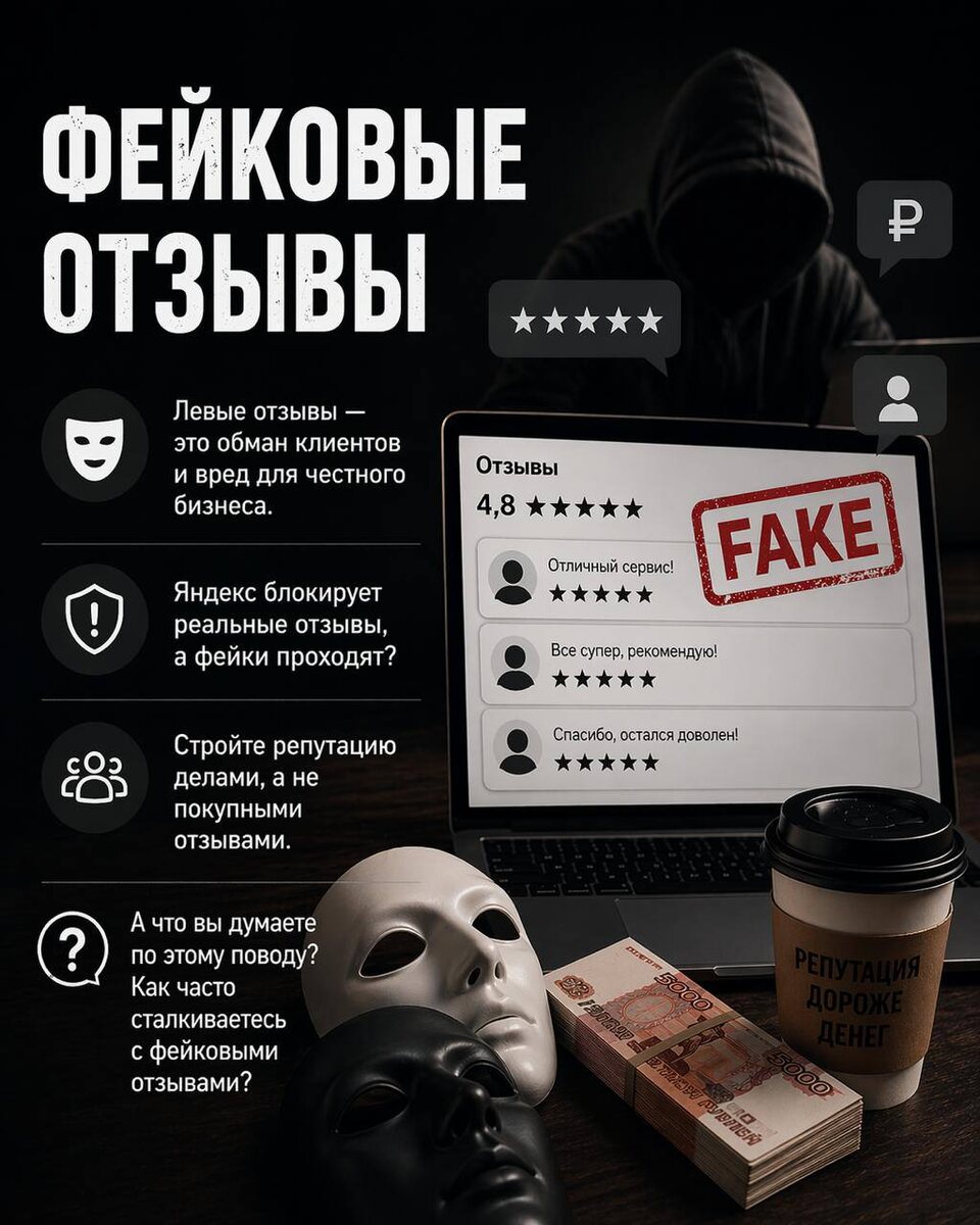 😶 Каждый месяц мне приходит 2–3 предложения «оставить» положительные отзывы за деньги. Одни зарабатывают на написании фейков, другие — покупают их, чтобы поднять свой рейтинг. Честно говоря, я не понимаю ни тех, ни других. Это чистый обман! Тот же Яндекс иногда блокирует реальные отзывы наших клиентов. Даже когда мы присылаем договор, фото и видео в саппорт, блок не снимается, а левые отзывы при этом спокойно проходят? Если вы молодая компания — первые 1–3 года работайте на имя и создавайте себе репутацию, даже если будет тяжело. Набирайте реальный рейтинг через качественную работу и подход. Левые отзывы не дадут вам ни опыта, ни настоящего роста, зато создадут кучу лишних проблем в будущем. Если вы клиент — читайте вдумчиво: обычно левые отзывы считываются по тексту и фото. А что вы думаете по этому поводу? Как часто сталкиваетесь с фейковыми отзывами? 👇