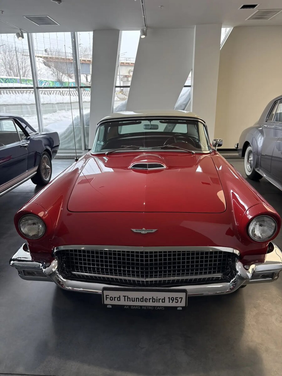 На фото очередной экспонат с выставки в Казани Ford Thunderbird 1957 года выпуска. Название автомобиля Ford Thunderbird переводится на русский язык как «Форд Громовая птица». Название отражает идею мощного и стремительного транспортного средства, ассоциируемого с мифической громовой птицей, символизирующей силу и скорость. Несколько интересных особенностей и фактов: Первый двухместный автомобиль Ford: Thunderbird стал первым серийным автомобилем Ford, предназначенным исключительно для двух пассажиров. Это было новаторским решением, направленным на создание спортивного автомобиля класса люкс. Дизайн и инновации: Модель 1957 года получила обновленный дизайн с более агрессивными линиями кузова и увеличенными задними крыльями, которые стали визитной карточкой модели. Автомобиль оснащался мощными двигателями V8 объемом 5,1 литра, что обеспечивало отличную динамику. Комфорт и роскошь: Несмотря на спортивный характер, Thunderbird предлагал высокий уровень комфорта и удобства. Внутри автомобил