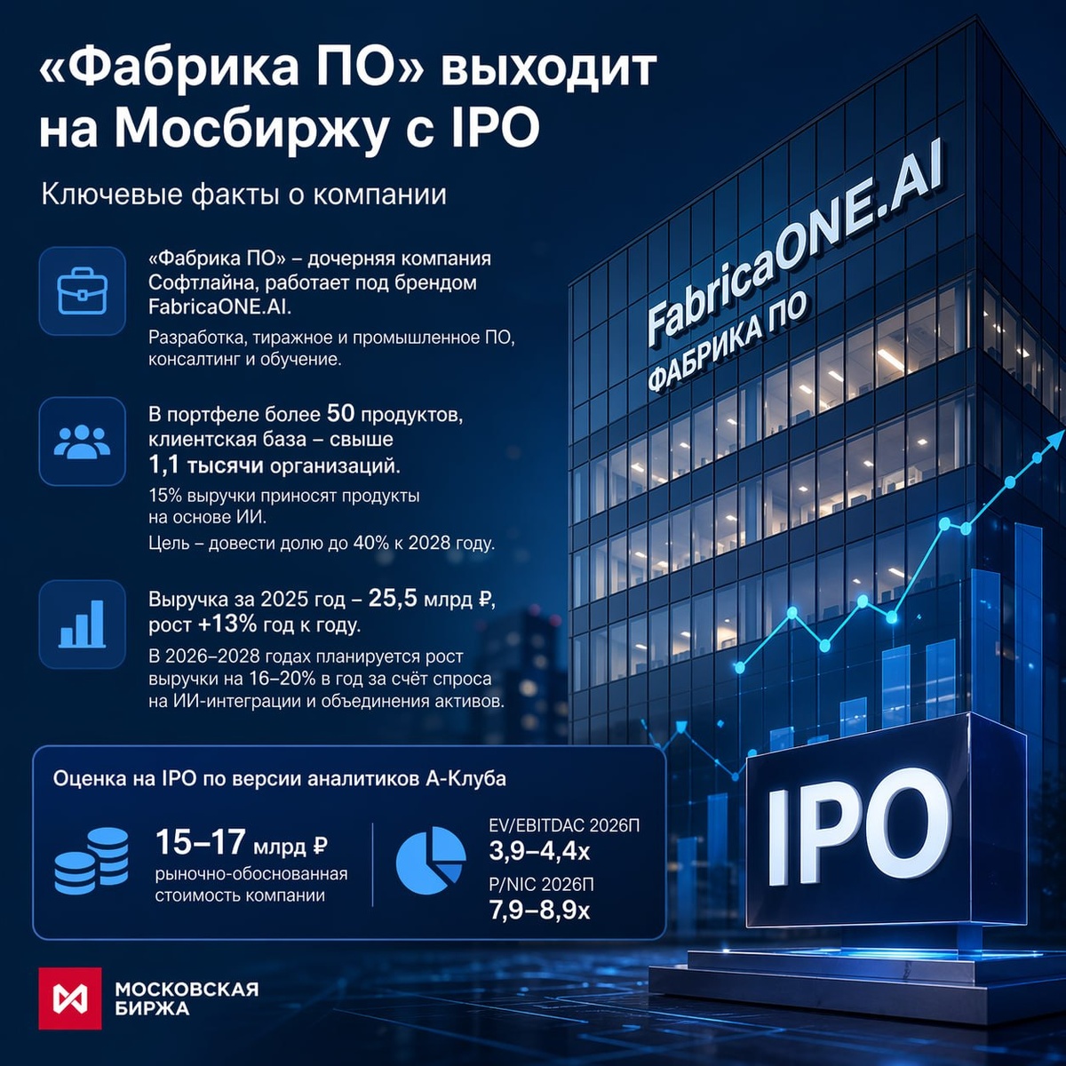 На Мосбирже может появиться ещё одна ИТ-компания — «Фабрика ПО» (бренд FabricaONE.AI). История в целом понятная: крупный игрок из экосистемы Софтлайн выводит на рынок отдельный бизнес с понятной специализацией — разработка, софт, консалтинг и обучение. По цифрам всё выглядит достаточно спокойно. Выручка — 25,5 млрд рублей за 2025 год, рост около 13%. Дальше закладывают 16–20% ежегодно, в основном за счёт спроса на ИИ-решения и объединения активов. В портфеле — больше 50 продуктов, клиентов — свыше тысячи. Около 15% выручки уже дают решения на базе ИИ, план — довести до 40% к 2028 году. Если отойти от цифр и посмотреть чуть шире, картина складывается типичная для текущего рынка. ИТ-компании постепенно упаковывают всё подряд в «ИИ-историю». Это логично: спрос есть, деньги туда идут, инвесторы на это реагируют. Вопрос скорее в том, насколько быстро эти 40% реально станут не просто планом, а устойчивым источником дохода. В целом кейс интересен не столько самой компанией, сколько сигналом: