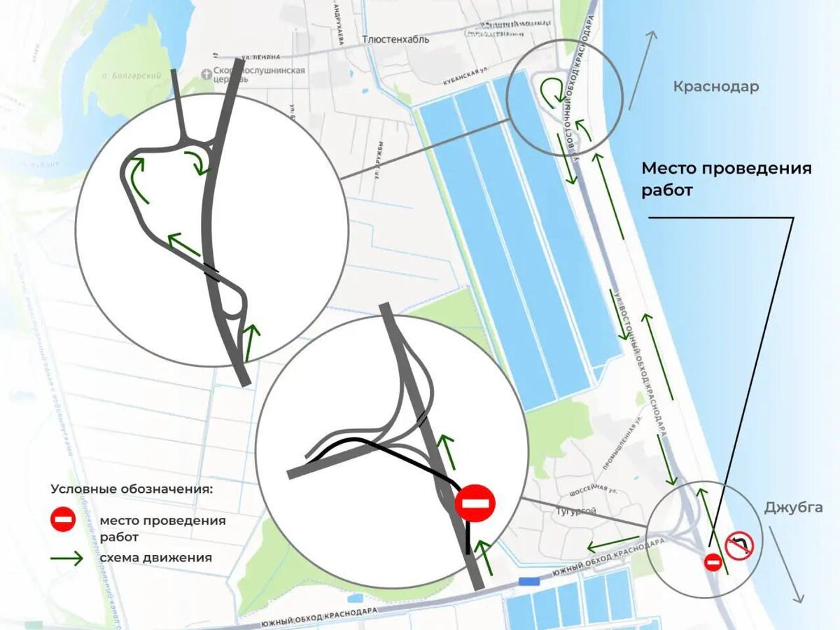 М-4 «Дон» в сторону Тахтамукая / Яблоновского. Объезд участка возможен через транспортную развязку у п. Тлюстенхабль. Схема движения представлена на картинке.
