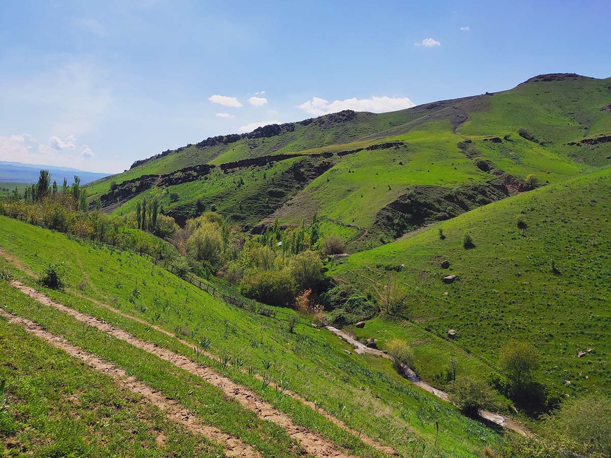 Всегда мечтала посмотреть поля диких тюльпанов. Несколько раз собиралась поехать в Калмыкию, но все не попадала с датами, и на момент отпуска тюльпаны уже отцветали. А тут неожиданно мы собрались погулять по весенним горам Узбекистана. И, аллилуйя, там цвели тюльпаны. Сначала встречались только единичные цветочки, но потом уже целые полянки, и не только красных, но и желтых цветов. Больше всего тюльпанов мы увидели в одном из самых популярных для прогулок мест - каньоне Таваксай. Ехать туда из Ташкента очень просто, около часа на электричке до станции Паргос, а там идем вверх по дороге и попутно ловим попутку. Подзаработать деньжат никто не откажется, так что довольно быстро доезжаем 4 км до конца поселка Салжарыс. А дальше тропинка вдоль ручья Таваксай. Вокруг ярко-зеленые холмы, по которым как на классическом пейзаже гуляют коровы и лошади. Сельская идиллия. Животные, правда, гуляют не только по холмам, но и по тропинке, так что под ноги нужно смотреть внимательно. Оживляют пейзаж